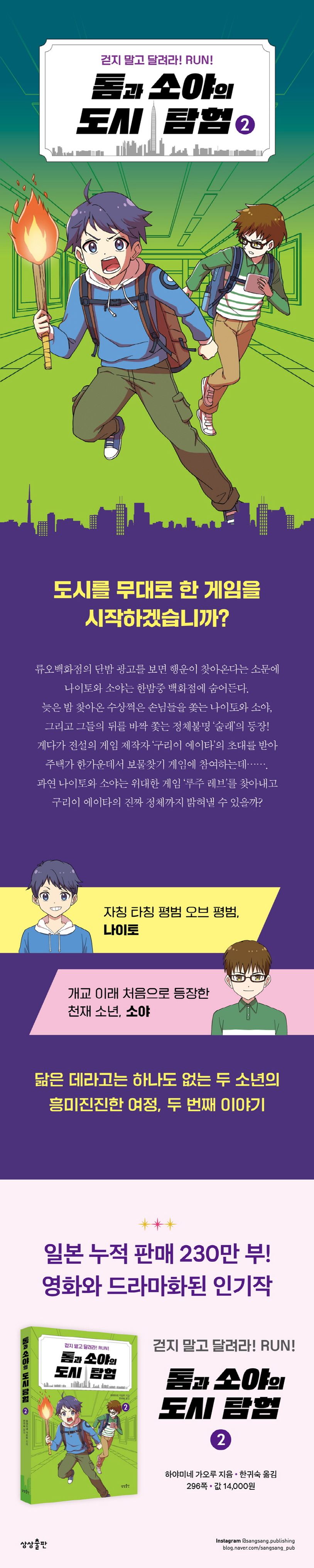 일본에서 영화로도 개봉된 어린이 추리소설 시리즈 『톰과 소야의 도시 탐험』이 두 번째 이야기로 돌아왔다. 이 책의 저자 하야미네 가오루는 초등학교 교사로 임용되어 책을 싫어하는 아이들이 읽을 만한 이야기를 찾다가 직접 글을 쓰기 시작했다. 읽기 쉬운 단순한 문장과 흥미진진한 전개도 재밌지만, 곳곳에 등장하는 과학 상식 또한 유익하다. 무엇보다 전혀 다른 두 주인공 소년의 캐릭터 조합이 시리즈의 인기 비결이다.