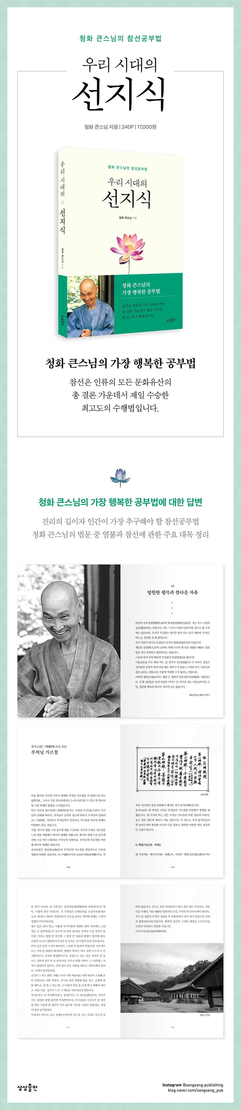 『우리 시대의 선지식』은 2017년도에 출간되어 많은 불자들에게 꾸준한 사랑을 받은 『청화 스님의 참선공부법』의 개정판으로 청화 큰스님이 생전에 직접 법문한 것을 원음 그대로 쉽고 간결하게 정리한 책입니다.