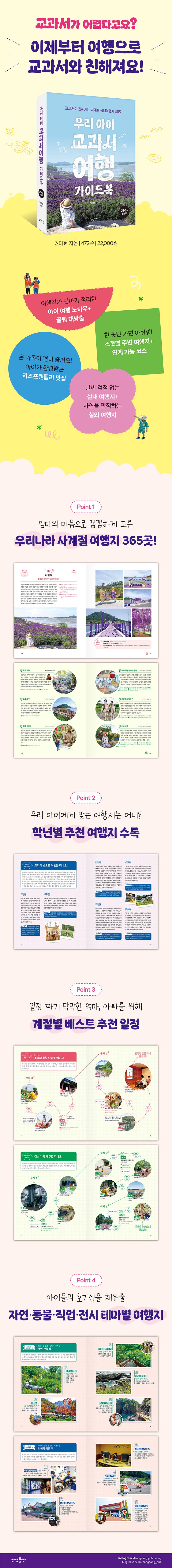 『우리 아이 교과서여행 가이드북』은 이런 육아동지들의 마음을 헤아려 야심차게 준비한 국내여행 가이드북이다. 베스트셀러 작가이자 두 아이의 엄마인 저자는 직접 아이들과 전국을 누비며 자연 명소, 박물관·미술관, 직업체험, 동물체험 등 아이들이 즐거워하면서 학습 효과가 뛰어난 여행지 365곳을 추렸다. 아이들은 교과서에서 배웠던 장소에 직접 가보는 여행을 통해 단순히 지식을 얻는 데 그치는 게 아니라 ‘나만의 특별한 경험’으로 고스란히 기억하게 된다. 이를 위해 책에 실린 여행지도 대규모 자본이 투입된 테마파크보다는 때 묻지 않은 자연과 사람들의 넉넉한 인심을 느낄 수 있는 곳 위주로 구성했다. 책의 차례는 독자를 배려해 봄, 여름, 가을, 겨울 계절별 차례를 기본으로 하되, 서울·인천, 경기권, 강원권, 충청권 등 지역별로도 일목요연하게 정리했다. 엄마 아빠에게 익숙한 여행지부터 엄마들 사이에서 알음알음 입소문이 난 여행지까지 총망라해 언제든 부모와 아이가 부담 없이 이 한 권으로 여행을 떠날 수 있다!