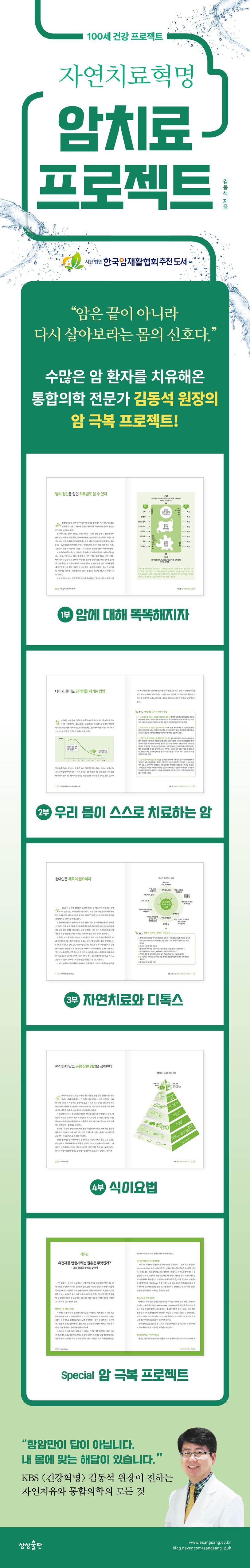김동석 원장은 면역력의 강화가 곧 암 치료의 시작이자 끝이라고 말하며 자연치유능력을 극대화하여 스스로 몸의 균형을 회복할 수 있는 방법을 구체적으로 제시한다. 이는 단순히 의학적 조언이 아니라 삶의 태도와 습관을 바꾸는 치유의 실천이기도 하다.