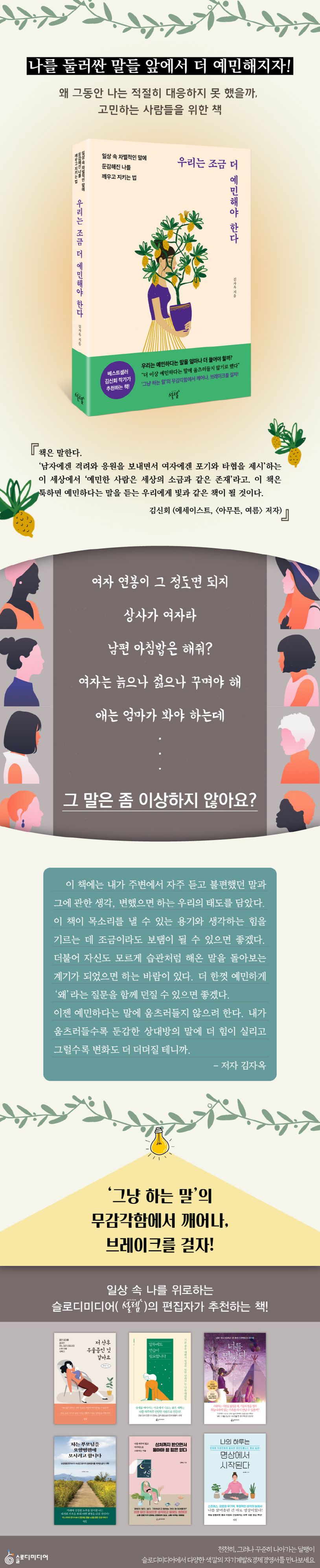 책은 말한다. ‘남자에겐 격려와 응원을 보내면서 여자에겐 포기와 타협을 제시’하는 이 세상에서 ‘예민한 사람은 세상의 소금과 같은 존재’라고. 이 책은 툭하면 예민하다는 말을 듣는 우리에게 빛과 같은 책이 될 것이다.