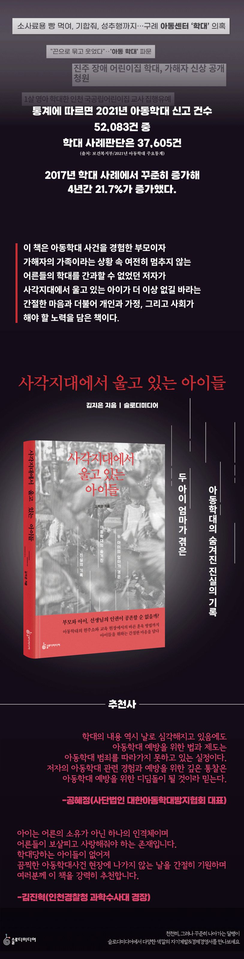 우리 사회에는 매일 수많은 사건이 일어나고, 그중에서도 특히 아동학대사건은 접할 때마다 침통한 기분을 지울 수가 없다. 학대의 내용은 날로 심각해지지만, 법과 제도는 피해아동들을 지켜주지 못하고 있다. 이 책은 사각지대에서 울고 있는 아이가 더 이상 없길 바라는 간절한 마음과 더불어 개인과 가정, 그리고 사회가 해야 할 노력을 담은 책이다.