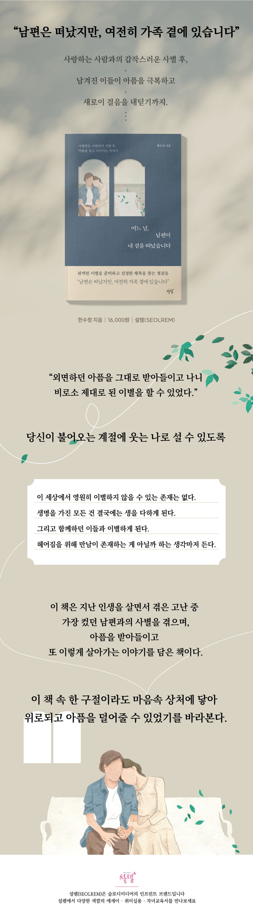 지난 인생을 살면서 겪은 고난 중 가장 컸던 남편과의 사별을 겪으며, 아픔을 받아들이고 또 이렇게 살아가는 이야기를 담은 책이다. 이 책 속 한 구절이라 도 마음속 상처에 닿아 위로되고 아픔을 덜어줄 수 있었기를 바라본다