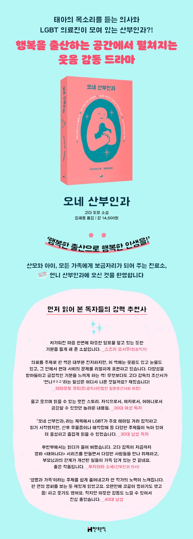 태아의 목소리를 들을 수 있는 특수한 능력을 가진 산부인과 의사가 다양한 젠더의 의료종사자들이 모인 클리닉에서 겪는 웃음과 감동의 이야기 『오네 산부인과』가 현대문학에서 번역 출간되었다. 다큐멘터리 영화 감독인 저자 고다 도모는 그간 〈태어나다〉 시리즈를 통해 출산과 육아, 가족 간의 사랑, 다양한 형태의 가정과 그 희로애락의 순간들을 영상으로 포착해 왔는데, 자신의 첫 소설에 이 경험을 녹여 ‘생명과 가족’이라는 주제를 따뜻하고 유쾌한 필치로 그려 냈다.
