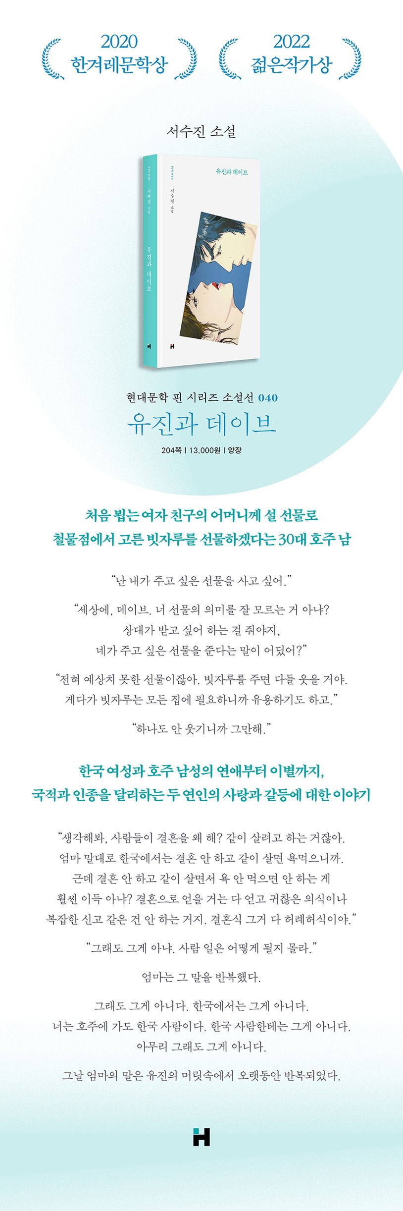 당대 한국 문학의 가장 현대적이면서도 첨예한 작가들을 선정, 신작 시와 소설을 수록하는 월간 『현대문학』의 특집 지면 〈현대문학 핀 시리즈〉의 마흔 번째 소설선, 서수진의 『유진과 데이브』가 출간되었다. 2020년, 장편소설 『코리안 티처』로 〈한겨레문학상〉을 수상하며 우리 문단에 혜성처럼 등장한 서수진의 이번 작품은 국적과 인종을 달리하는 두 연인의 사랑의 불가능성에 관한 진지한 고찰을 담은 소설이다.