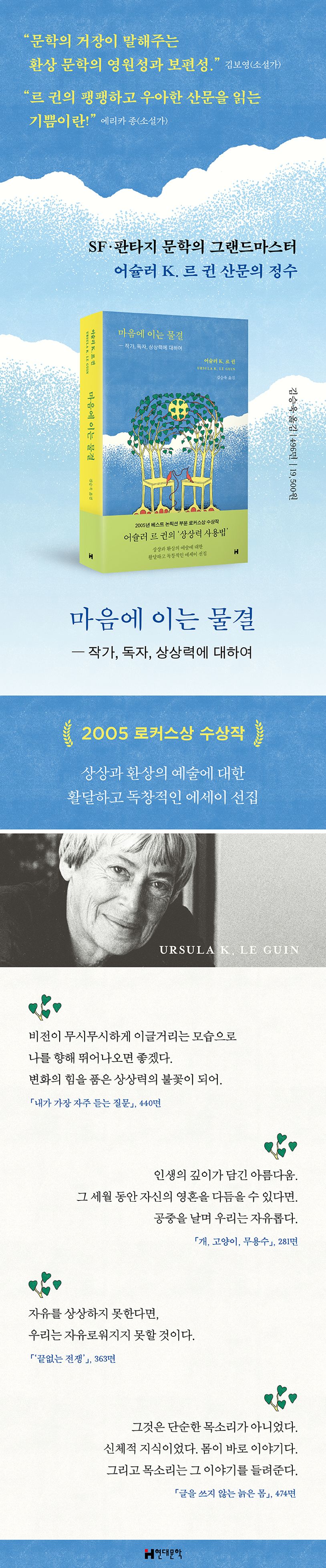 수십 년간 쌓아온 깊이 있는 필력과 유연한 상상력, 활달하고 독특한 필치로 어슐러 르 귄 산문의 정수를 담은 『마음에 이는 물결』은 “위대한 예술가들이 그리는 (…) 인생의 깊이가 담긴 아름다움”을 보여주는 작품집으로서, “평생 함께할 수 있는 책, 즉 인생과 같은 책”(마리아 포포바)으로 남을 것이다.