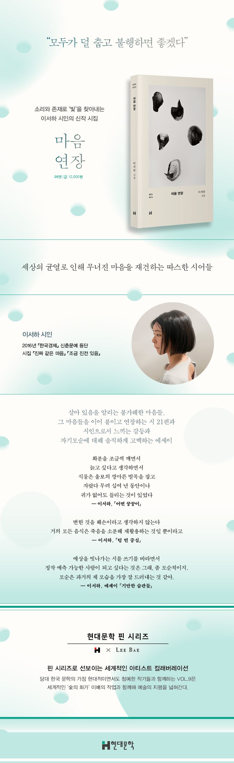 현대문학을 대표하는 한국 문학 시리즈인 〈현대문학 핀 시리즈〉 시인선 쉰한 번째 시집으로 이서하의 『마음 연장』을 출간한다. 2016년 『한국경제』 신춘문예로 등단해 “몸이 기억하는 상처를 우주적 명랑함으로 치환한 낙천성”이 돋보인다는 평을 받은 이서하 시인의 세 번째 시집이다.