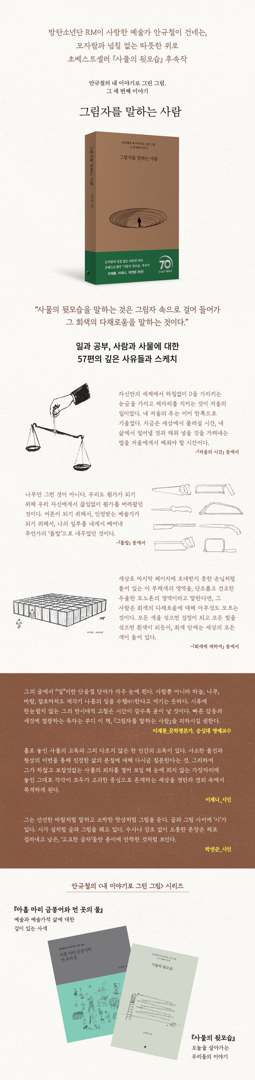 2010년부터 14년간 173회에 걸쳐 『현대문학』에 연재되고 있는 안규철의 그림 에세이 「내 이야기로 그린 그림」이 『그림자를 말하는 사람』으로 출간되었다. 『아홉 마리 금붕어와 먼 곳의 물』(2013년 10월 출간), 『사물의 뒷모습』(2021년 3월 출간)에 이은 세 번째 이야기가 담긴 이번 에세이집에는 미술뿐 아니라 문학, 철학에 이르기까지 치열하게 고민하며 작업해온 안규철의 일과 공부, 사람과 사물에 대한 깊이 있는 사유들이 57편의 스케치와 함께 담겨 있다.