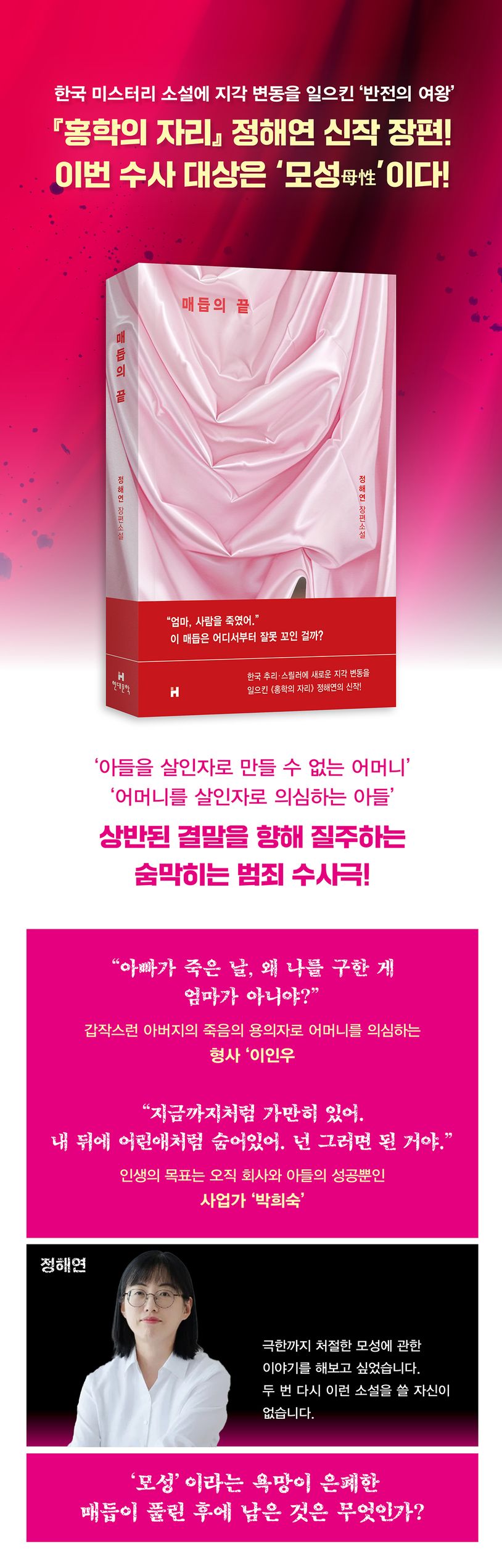 선보이는 작품마다 ‘뒤틀린 욕망이 사람을 어디까지 추락시킬 수 있는가’를 철저하게 파헤쳐온 정통파 추리·미스터리 스릴러 작가 정해연이 장편 신작 《매듭의 끝》으로 돌아왔다.