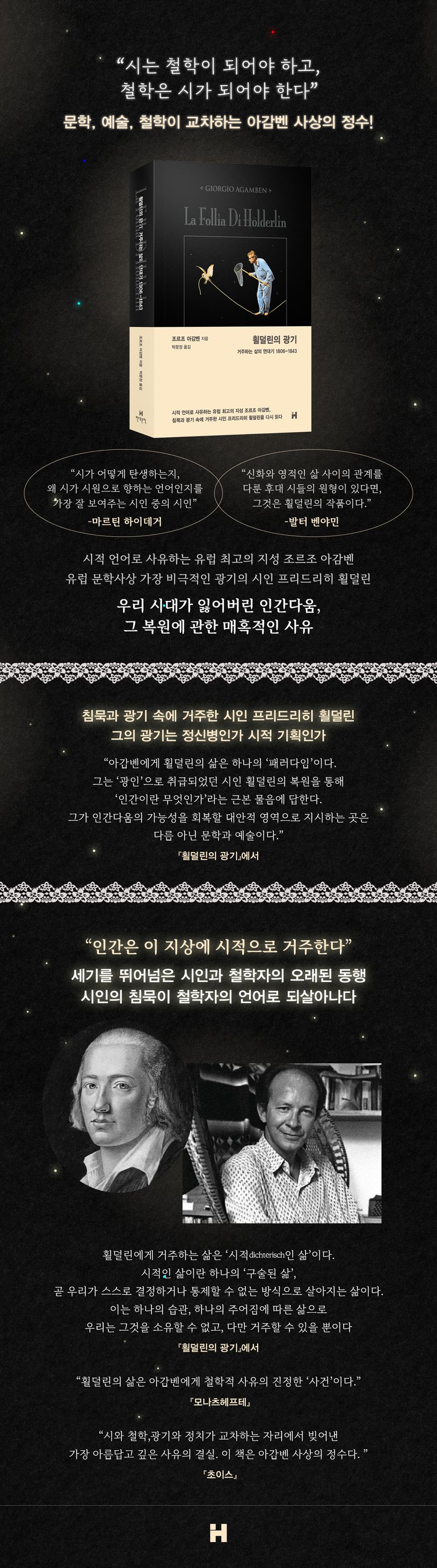 ‘횔덜린’ 하면 반생을 정신착란 가운데 외롭고 불우하게 살아야 했지만 셸링, 헤겔과 함께 독일 이상주의 철학에 기초를 놓고 헤세와 릴케, 파울 첼란 등 독일의 내로라하는 후대 문학가뿐 아니라 니체와 하이데거, 벤야민, 블량쇼 등 사상가에게까지 깊은 영향을 준 천재 시인으로 알려져 있다. 그의 삶은 36세까지 세상과 소통하며 살았던 전반기, 그리고 이후 36년간 정신착란에 빠져 외부 세계와 단절한 채 튀빙엔의 한 목수 집에 은둔하며 살았던 후반기로 나뉘는데, 아감벤은 소위 ‘광기의 시기’로 정의되어온 1806년 이후의 삶과 작품을 조심스레 더듬으며, 철저히 문학적인 동시에 존재론적 독해를 시도한다. 이를 통해 횔덜린의 광기를 단순히 병리적 차원으로 보지 않고, 오히려 인간 존재의 근원적 방식, 즉 ‘거주하는 삶das wohnende Leben’이라는 시적, 철학적 가능성을 포착한다. 그럼으로써 그가 병들고 무너진 존재가 아니라 “인간은 이 지상에 시적으로 거주한다”는 자신의 문학적 명제를 온 삶으로 증명해낸 시인이었음을 밝힌다.