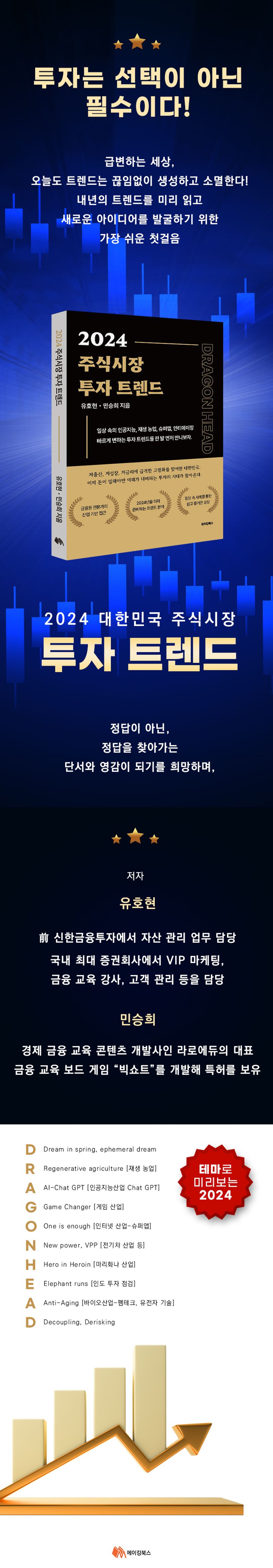 지난 3년간 주식시장 투자 트렌드 시리즈는 독자들에게 정답이 아닌, 정답을 찾을 수 있는 단서와 영감이 되기를 희망하며 쓰였다. 이번 『2024 주식시장 투자트렌드: DRAGON HEAD』를 통해 2024년의 단서를 향한 호기심의 문이 열리기를 기대한다.