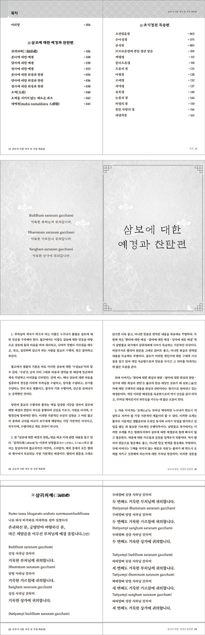 머리말삼보에대한예경과찬탄편삼귀의례(三歸依禮)붓다에대한예경담마에대한예경상가에대한예경붓다에대한회상과찬탄담마에대한회상과찬탄상가에대한회상과찬탄오계(五戒)오계를지키지않는해로운과보대예경(mahānamakkāra大禮敬)초기경전독송편초전법륜경무아상경분석경37보리분법에관한경전말씀계행경불타오름경흐름의경아침경보배경자애경축복경눈물의경파멸의경천한사람의경대념처경대승경전독송편천수경반야심경금강반야바라밀경불설아미타경관세음보살보문품화엄경보현행원품원각경보안보살장지장보살본원경다라니dhrani독송편능엄신주츰부다라니불설소재길상다라니무량수여래근본다라니무량수불설왕생정토주무구정광대다라니관세음보살본심미묘육자대명왕진언법신진언광명진언약사유리광여래불대진언항마진언참회와발원문편행선축원문(行禪祝願文)이산혜연선사발원문(怡山惠然禪師發願文)네가지무량한마음(四無量心)에대한발원자애발원문(慈愛發願文)수행공덕회향발원문108대참회문(百八大懺悔文)연지대사왕생극락발원문(蓮池大師往生極樂發願文)영가천도발원문(靈駕薦度發願文)수행에도움이되는말씀과게송편부처님의오도송(悟道頌)붓다의전법선언모든진리는사성제에포함되나니사성제(四聖諦)에대한찬탄게송연기를보는자는법을보나니법은여래의출현전에존재하나니삼법인(三法印)에대한게송자신과법을섬과귀의처로삼아라칠불통게(七佛通偈)법과율이그대의스승이니정법의기준은이러하니법과율의8가지특성은바른견해(正見)를지닌사람삿된견해(邪見)를지닌사람전도된인식(顚倒夢想)에빠져있는사람바른가르침(正法)의판단기준감각기능(六門)을단속해야하나니다섯가지장애(五蓋)를제거할지니가장으뜸가는법의보시보시도대상에따라과보가다를지니보시의다섯가지이익재가자의계를지키는다섯가지이익얻기어려운네가지진정한일곱가지재산자주성찰해야할게송발심하여수행할것을권하는말씀법성게(法性偈)무상게(無常偈)회향게송(回向偈頌)오관게(五觀偈)공양게송일반공양게송부록1:정근精勤하는법석가모니불정근관세음보살정근아미타불정근지장보살정근약사여래불정근신중단정근칠성단정근산신단정근부록2:불교경전에대한이해1.불교경전에대한이해2.초기경전의결집3.빠알리대장경에대한이해4.대승경전의편찬과바른이해