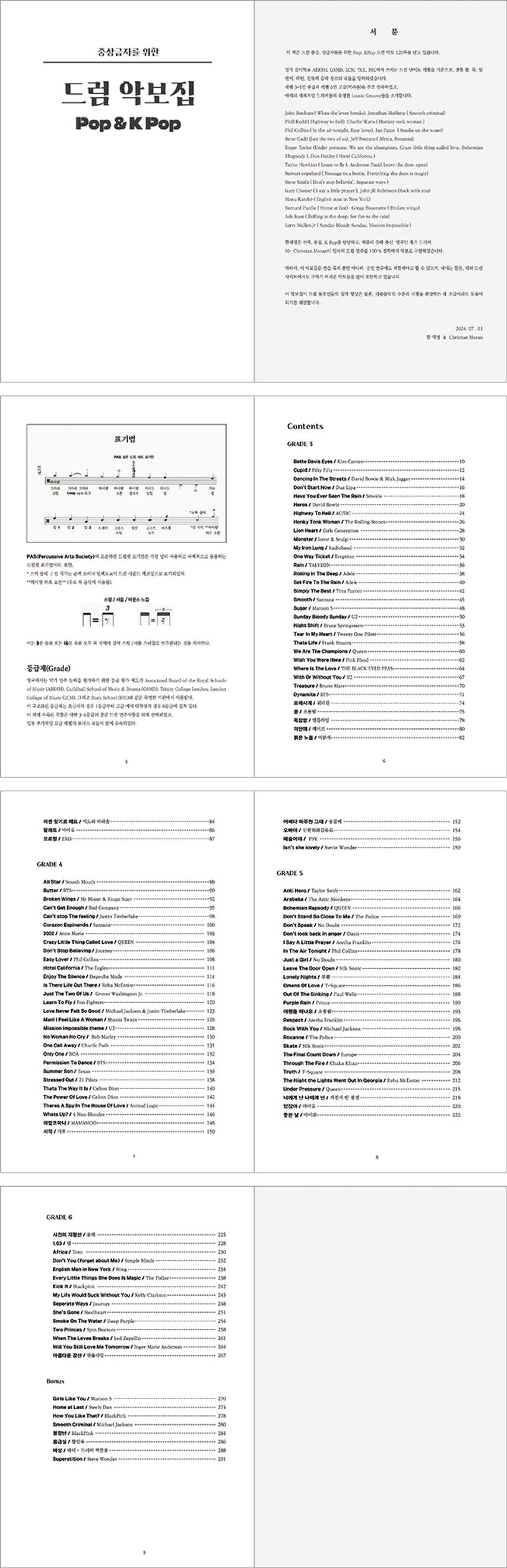 드럼 중급, 상급자들을 위한 Pop, KPOP 드럼 악보 120곡을 담은 악보집. 영국 음악학교 ABRSM. GSMD, LCM, TCL, RSL에서 쓰이는 드럼 난이도 레벨을 기준으로, 레벨 3-5인 중급과 레벨 6인 고급 곡을 주로 선곡하였고, 다양한 장르의 곡을 망라하였다.