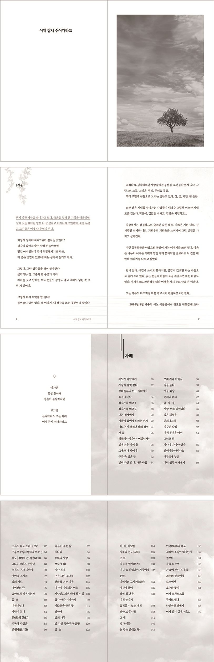 윤휘 시인은 진솔하고 간결한 문장으로 삶에 대한 웅숭깊은 사유를 그려 낸다. 그 속에는 보통 사람의 기쁨과 슬픔이, 여행지에서의 감회가, 지난날에 대한 애수가 고스란히 녹아 있다. 본 시집을 통해 시가 이미 우리 삶 속에 스며 있음을, 얼핏 누추해보이는 생의 순간 속에도 아름다움이 깃들어 있음을 새삼 배울 수 있다. 페이지 한쪽에는 각 시와 어울리는 이미지들이 독자의 공감을 돕고 색다른 즐거움을 더한다.