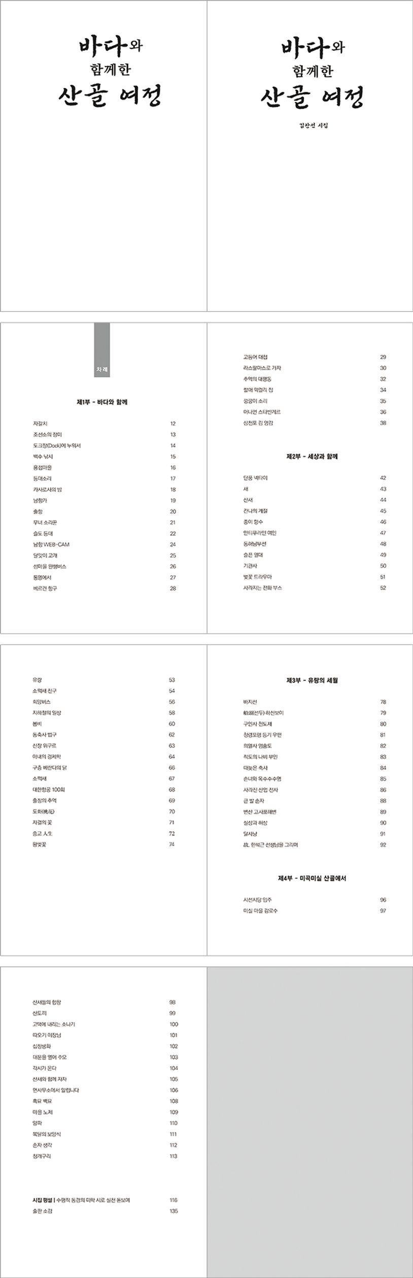 제1부-바다와함께자갈치조선소의장미도크장(Dock)에누워서백수낚시용접마을등대소리카사로사의밤남항가출항무녀소리꾼슬도등대남항WEB-CAM달맞이고개섬마을완행버스통영에서베르겐항구고등어대첩라스팔마스로가자추억의대평동할매막걸리집깡깡이소리머나먼스타반게르삼천포김영감제2부-세상과함께단풍넥타이새산새칸나의계절종이향수안티푸라민여인동해남부선슬픈열대기관사벚꽃트라우마사라지는전화부스유랑소쩍새친구희망버스지하철의일상봄비동축사법구신장위구르아내의경제학구층베란다의닭소쩍새대한항공100회출장의추억도화(桃花)자결의꽃중고人生왕벚꽃제3부-유랑의세월바지선船頭(선두)하산보이구인사천도재청령포행등기우편의열사엄흥도적도의나비부인때늦은축사손녀와옥수수수염사라진산업전사큰발손자변산고사포해변실상과허상달사냥故,한석근선생님을그리며제4부-미곡미실산골에서시선시당입주미실마을감로수산새들의합창산토끼고택에내리는소나기따오기이장님십장생화대문을열어주오각시가온다산새와함께자자면사무소에서알립니다흑묘백묘마을노제양파복달의보양식손자생각청개구리시집평설|수평적동경의미학시로실천돋보여출판소감