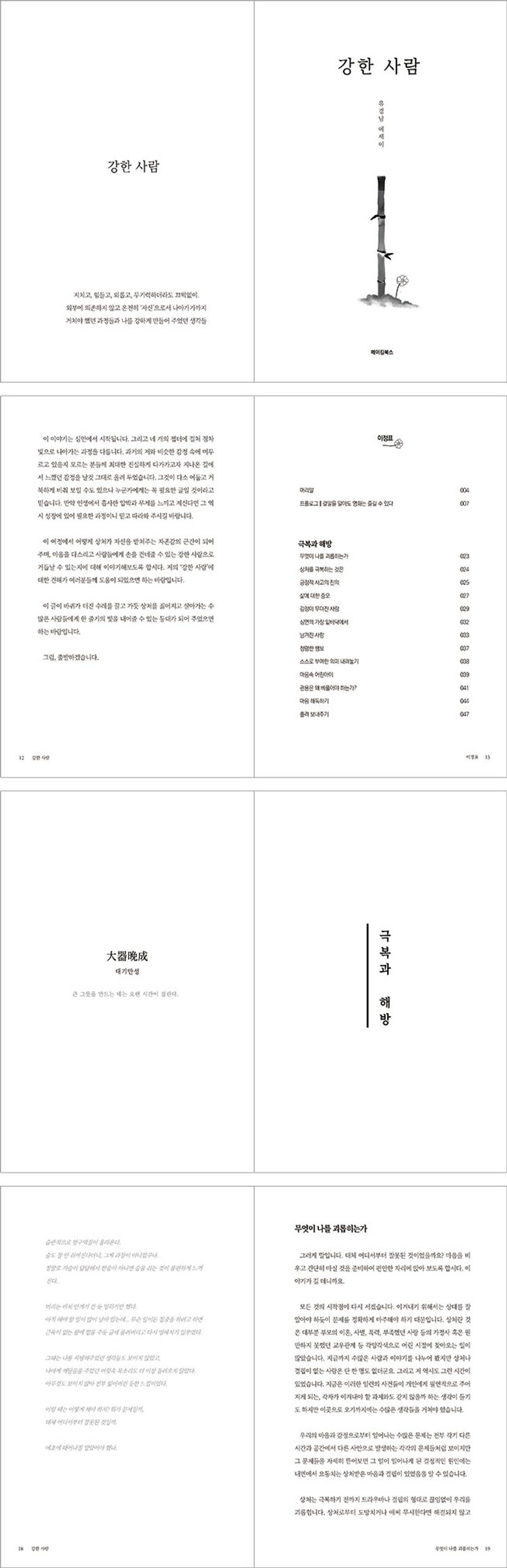 책 ‘강한 사람’은 심연 속에서 홀로 가라앉아가던 한 영혼이 자기 자신을 마주하고, 강한 사람으로 나아가는 삶을 살기 위해 겪었던 과정을 돌아보고 관찰하여, 자신을 받쳐주었던 수많은 깨달음을 담아 글로서 나누기 위한 에세이입니다.