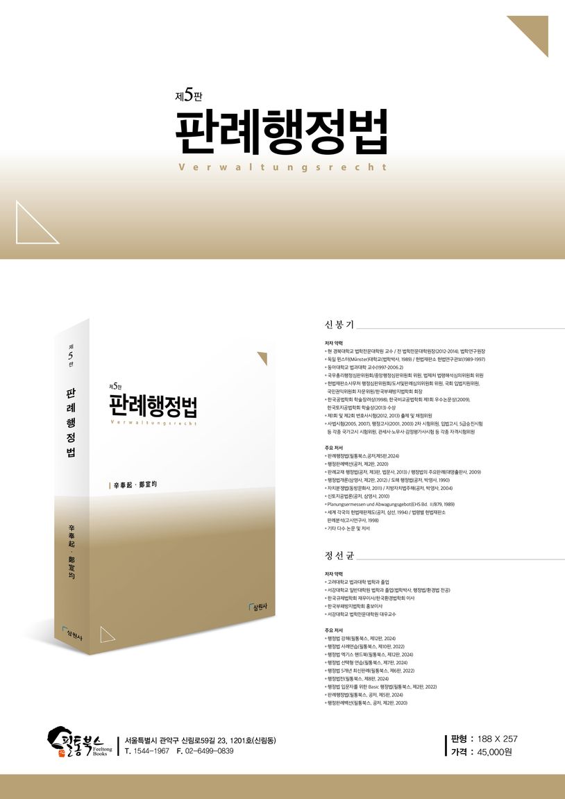 ▣저자약력현경북대학교법학전문대학원교수/전법학전문대학원장(2012-2014),법학연구원장독일뮌스터(Münster)대학교(법학박사,1989)/헌법재판소헌법연구관보(1989-1997)동아대학교법과대학교수(1997-2006.2)국무총리행정심판위원회/중앙행정심판위원회위원,법제처법령해석심의위원회위원헌법재판소사무처행정심판위원회/도서및판례심의위원회위원,국회입법지원위원,국민권익위원회자문위원/한국부패방지법학회회장한국공법학회학술장려상(1998),한국비교공법학회제1회우수논문상(2009),한국토지공법학회학술상(2013)수상제1회및제2회변호사시험(2012,2013)출제및채점위원사법시험(2005,2007),행정고시(2001,2003)2차시험위원,입법고시,5급승진시험등각종국가고시시험위원,관세사·노무사·감정평가사시험등각종자격시험위원▣주요저서판례행정법(필통북스,공저,제5판,2024)행정판례백선(공저,제2판,2020)판례교재행정법(공저,제3판,법문사,2013)/행정법의주요판례(대명출판사,2009)행정법개론(삼영사,제2판,2012)/도해행정법(공저,박영사,1990)자치분쟁법(동방문화사,2011)/지방자치법주해(공저,박영사,2004)신토지공법론(공저,삼영사,2010)PlanungsermessenundAbwagungsgebot(EHSBd.Ⅱ/879,1989)세계각국의헌법재판제도(공저,삼선,1994)/법령별헌법재판소판례분석(고시연구사,1998)기타다수논문및저서