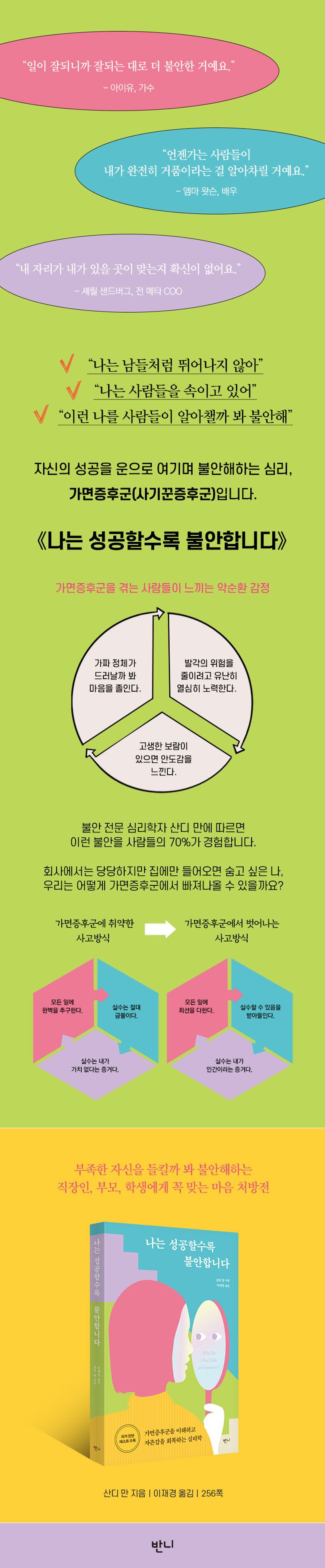 공포증과 공황 발작, 강박, 트라우마 같은 불안 감정을 전문적으로 치료하는 산디 만 심리학 교수는 수많은 상담을 바탕으로 이 책에서 가면증후군에서 벗어날 수 있는 명확한 방법을 제안한다. 책에는 가면증후군을 가장 흔하게 겪는다고 알려진 직장인 여성부터 남성, 부모, 학생에 이르기까지 각자가 처한 환경에 따라 느끼는 불안을 설명하고 그에 맞는 처방전을 전한다. 왜 자신이 가면증후군을 겪게 되는지, 여기에는 어떤 심리적 기저가 깔려있는지에 대한 쉬운 설명은 그에 따른 대처 요령과 전략으로 이어진다.