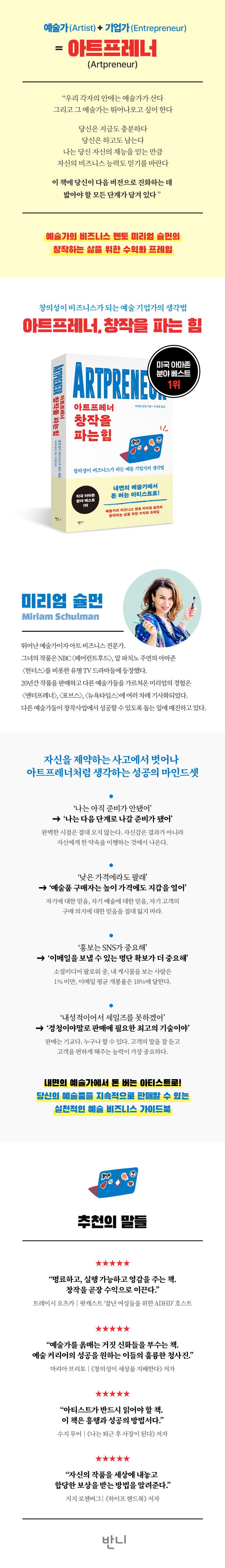 저자 미리엄 슐먼은 금융권에서 쌓은 경력을 뒤로 하고 예술가와 아트 비즈니스 전문가로 성공하기 위한 여정에 올랐다. 지난 20년간 뛰어난 예술가이자 아트 비즈니스 전문가로 성장한 저자는 자신이 고안한 ‘열정-수익(Passion to Profit)’ 프레임워크를 바탕으로 다른 예술가들이 창작사업에서 성공할 수 있게 돕는 일에 매진해왔다. 당신도 꿈틀대는 창의성을 간직한 채 창작자의 삶으로 뛰어들기를 주저하고 있지는 않은가? 그렇다면 예술가에게 필요한 긍정적인 마인드와 비즈니스 스킬을 모두 다룬 이 책이 “내면의 예술가에서 돈 버는 아티스트”로 도약하는 결정적인 계기가 되어줄 것이다.