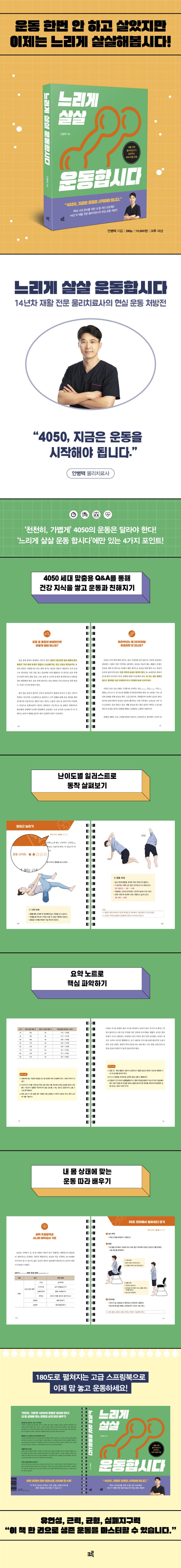 4050 세대에서 적당히 운동하는 방법을 담은 이 책은 14년간 재활/스포츠 분야에서 다양한 근골격계 환자들의 재활을 도운 재활 전문 물리치료사가 최초로 공개하는 맞춤 운동 안내서다. 연령대에 맞는 ‘개인 맞춤 운동 프로그램’을 만들어 실행해온 그는 그동안의 임상 경험과 연구를 접목해, 40~50대에 적절한 운동법과 건강관리법을 이 책에 담았다. 노화를 조금이라도 늦추는 방법이 궁금한 이들이라면, 이 책을 통해 백세 시대 준비를 위한 내 몸 개선 프로젝트를 실천해 보자. 느려도 좋다. 천천히 따라오면 된다.