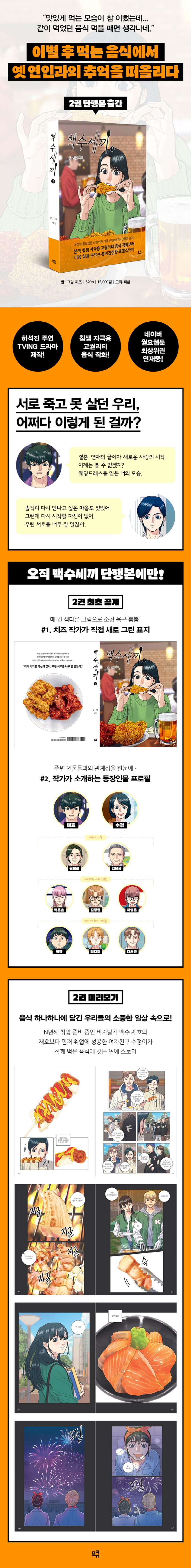 N년째 취업 준비 중인 비자발적 백수 재호와 재호보다 먼저 취업에 성공한 여자친구 수정이가 함께 먹은 음식에 깃든 연애 스토리를 다룬 [백수세끼]의 단행본 2권.