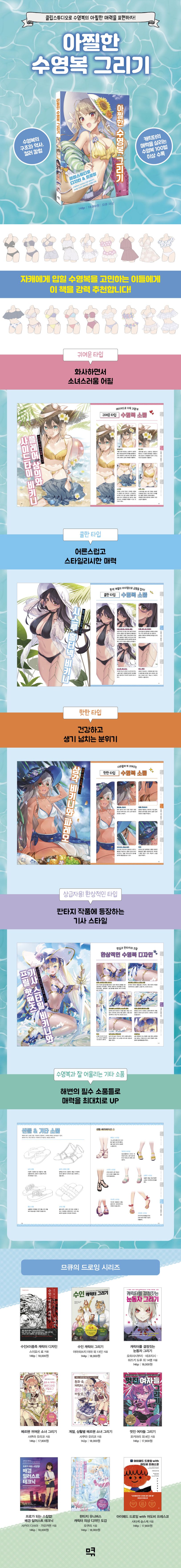귀여운 타입, 쿨한 타입, 핫한 타입 캐릭터에게 입힐 수영복을 그려보자! 프로 일러스트레이터들이 그린 100벌 이상의 수영복과 소품을 통해 안목을 기를 수 있을 것이다. 모노키니, 방도 비키니, 언더붑 비키니 등의 트렌디한 수영복과 레그 엑세서리, 비치 샌들 등의 다양한 소품이 마련돼 있으니 자캐의 매력을 아찔하게 표현하고 싶은 일러스트레이터라면 주목해 보자.
