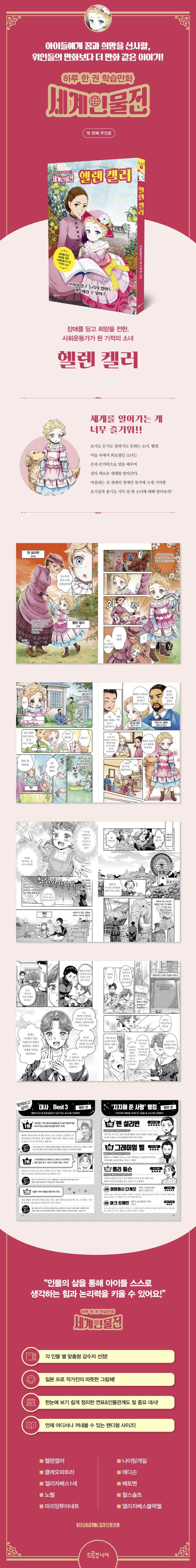 〈세계인물전〉, 그 첫 번째 여정의 주인공은 ‘헬렌 켈러’다. 보지 못하고 듣지 못했지만, 전 세계의 장애인들에게 희망을 전한 사회운동가 헬렌 켈러. 그녀는 신체적 장애를 극복한 위대한 인물로 잘 알려져 있다. 하지만 헬렌의 어린 시절을 들여다보면, 그녀 또한 여느 아이들처럼 장난기 가득한 한 소녀였다는 사실을 알 수 있다. 설리번 선생님과 벨 박사님을 비롯한 사람들은 그런 헬렌이 주어진 삶을 잘 살아나갈 수 있도록 곁에서 힘이 되어 준다. 어떻게 보이지도 않고 들리지도 않던 한 소녀가 용감한 인물로 성장해 세상을 바꿀 수 있었을까. 헬렌의 이야기를 통해 독자 여러분들이 삶을 살아내는 용기와 지혜를 얻어갈 수 있기를 바란다.