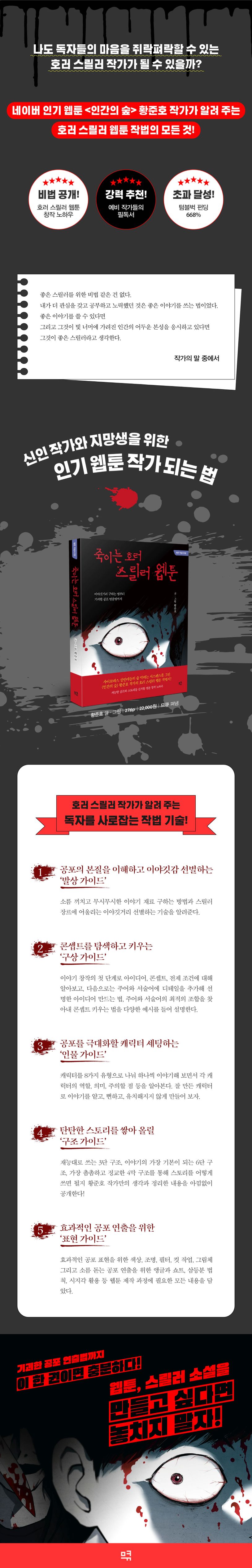 웹툰 창작 노하우를 알려 주는 웹툰 작법서 시리즈의 두 번째 이야기, 호러 스릴러 편이 출간됐다. 《죽이는 호러 스릴러 웹툰》은 공포의 본질을 이해하고 이야깃감 선별하는 ‘발상 가이드’, 무서운 콘셉트를 탐색하고 키우는 ‘구상 가이드’, 공포를 극대화할 캐릭터 세팅하는 ‘인물 가이드’, 손에 땀을 쥐게 할 스토리를 위한 ‘구조 가이드’, 소름 돋는 공포 연출을 위한 ‘표현 가이드’까지 호러 스릴러 웹툰을 창작하는 데 필요한 모든 내용을 담았다. 또, 이야기 쓰기의 보편적 규칙들을 공포에 어떻게 적용하는지 정리하면서도 웹툰을 연재하면서 겪은 현직 작가의 고민과 생각도 솔직하게 담았으니 이 책 한 권이면 나도 독자들의 마음을 쥐락펴락할 수 있는 호러 스릴러 작가가 될 수 있다.
