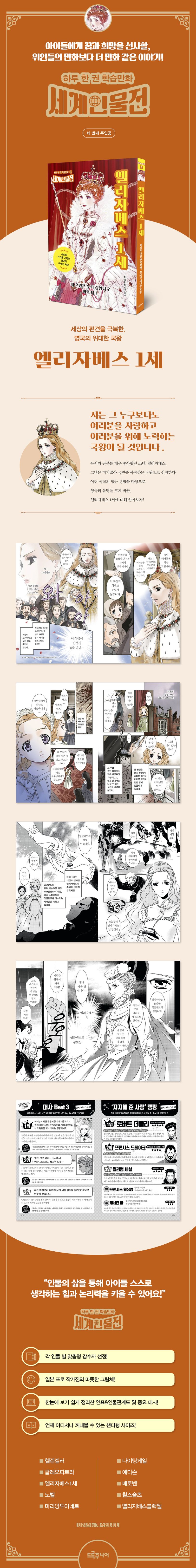 〈세계인물전〉, 그 세 번째 여정의 주인공은 ‘엘리자베스 1세’다. 세상의 편견을 극복하고 영국의 위대한 국왕이 된 엘리자베스. 그녀는 여성이 핍박받던 시절, 3살이 되기도 전에 어머니를 여의고 험한 세상을 헤쳐나가야 했다. 물론 곁에서 엘리자베스를 도와주는 이들도 있었다. 소꿉친구인 ‘로버트 더들리’와 의붓어머니 ‘캐서린 파’ 등이 그들이다. 하지만 25살에 여왕의 자리에 오른 엘리자베스는 왕관의 무게를 홀로 견뎌내야만 했다. 어린 나이에 그것도 여자가 왕의 자리에 올랐으니, 그 시대 사람들이 엘리자베스를 가만두지 않은 것은 당연했다. 편견으로 가득한 시대에 왕이 된 엘리자베스. 그녀는 어떻게 세상의 편견을 극복하고 영국의 위대한 국왕이 될 수 있었을까. 엘리자베스의 이야기를 읽어가다 보면, 독자 여러분들은 세상에 맞서는 용기와 지혜를 배워갈 수 있을 것이다.
