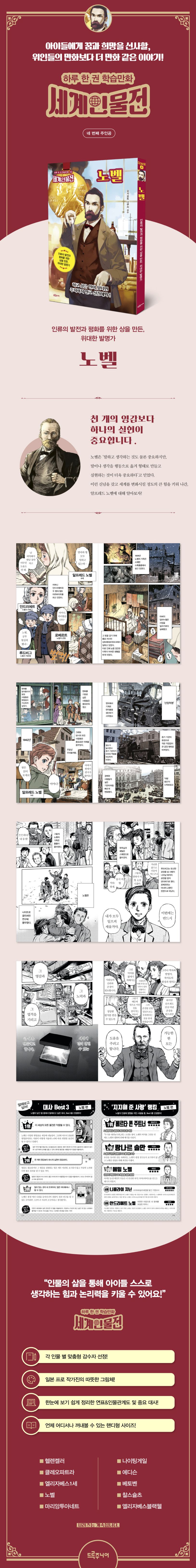 위대한 업적을 남겼다고 해서, 그들 삶의 밝은 부분만 조명할 수는 없다. 현대를 살아가는 우리 아이들이 ‘객관적인 시선’을 기를 수 있도록, 명과 암을 함께 보여줘야만 한다. 드루주니어 〈세계인물전〉은 여기에 주목했다. ‘위인전’이라는 형식의 장점은 살리되, ‘미화’라는 한계는 경계하고 보완하여 구성했다. 각 인물에 적합한 감수자가 최대한 객관적인 눈으로 전체 내용을 감수했으며, 주요 독자층인 아동의 눈높이에 맞게 주요 사건을 각색했다. 허구의 내용을 등장시키지 않음으로써, 유치함은 덜어내고 유익함은 더했다. 인물 간의 대화와 독백이 만화 속 설명문과 잘 어우러져 있어서 재미있게 읽을 수 있다. 우리 아이들이 배경에 대한 정보와 시대상을 더 자연스럽게 파악할 수 있도록, 세심한 노력을 기울였다.