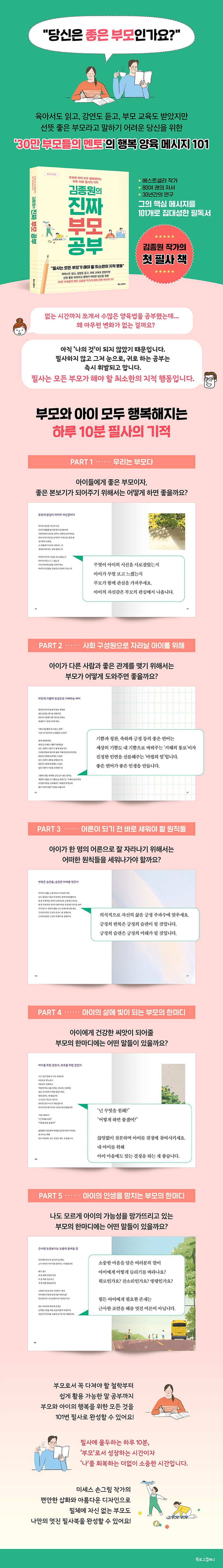 『김종원의 진짜 부모 공부』는 매 순간 ‘필사’를 강조해 온 김종원 작가의 첫 필사 책이다. 30년간 인문학과 자녀 교육을 연구하며 80여 권의 책을 쓰고, 그에 몇십 배에 달하는 사색으로 지혜를 쌓은 저자가 부모라면 가슴에 꼭 새겨야 할 핵심 인사이트를 101개의 행복 양육 메시지로 집대성했다. 많은 부모들과 경험을 나누며 그 효과를 검증한 ‘진짜’ 메시지들이다. 좋은 부모가 되고 싶어 노력했지만, 점점 더 큰 죄책감과 스트레스에 시달리는 일상의 반복이었다면 당장 이 책을 필사하자. 아이와 스스로를 미워하던 과거에서 벗어나 행복한 오늘을 맞이할 수 있을 것이다.