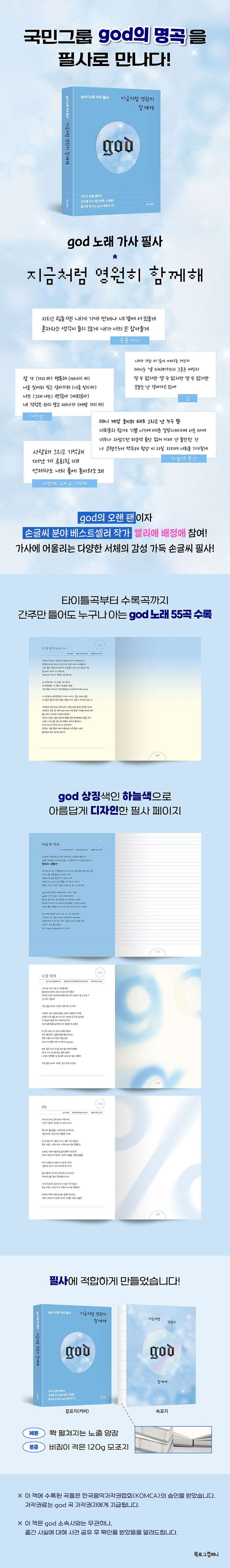 대한민국을 대표하는 ‘국민그룹’ god의 대표곡을 한 권의 필사책으로 엮은 『지금처럼 영원히 함께해』가 출간된다. 특히, god의 오랜 팬이자 손글씨 분야 베스트셀러 작가 ‘캘리애 배정애’가 직접 가사를 써 내려가, 단순한 활자를 넘어선 ‘가사의 밀도 있는 감성’과 ‘필사의 몰입’을 선사한다.