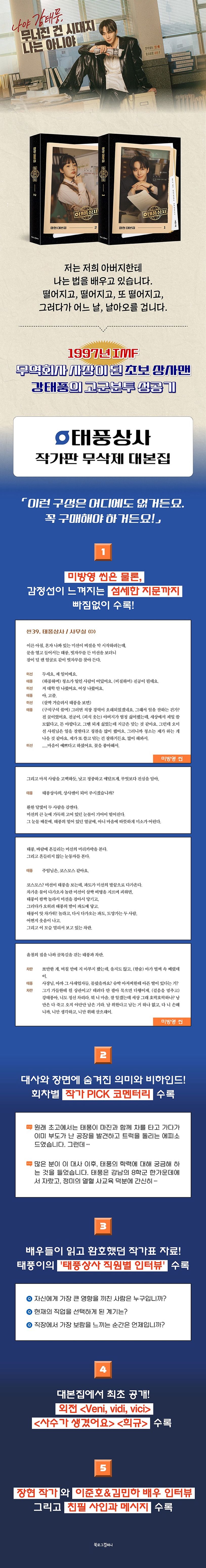 이번 대본집에서는 방송에서 볼 수 없던 삭제 장면과 상세한 지문은 물론, 대사와 장면의 비하인드를 담은 ‘작가 PICK 코멘터리’, 캐릭터들의 숨겨진 전사가 담긴 ‘등장인물 소개’, 배우들이 읽고 환호한 작가표 자료 ‘태풍이의 태풍상사 직원별 인터뷰’, 최초 공개되는 외전 〈Veni, vidi, vici〉, 〈사수가 생겼어요〉, 〈희규〉까지 다양한 자료를 만날 수 있다. 장현 작가와 이준호·김민하 배우 인터뷰도 수록해 드라마를 더 깊게 즐길 수 있으며, 면지에는 작가와 두 배우의 친필 사인과 메시지를 수록해 소장 가치를 더했다.