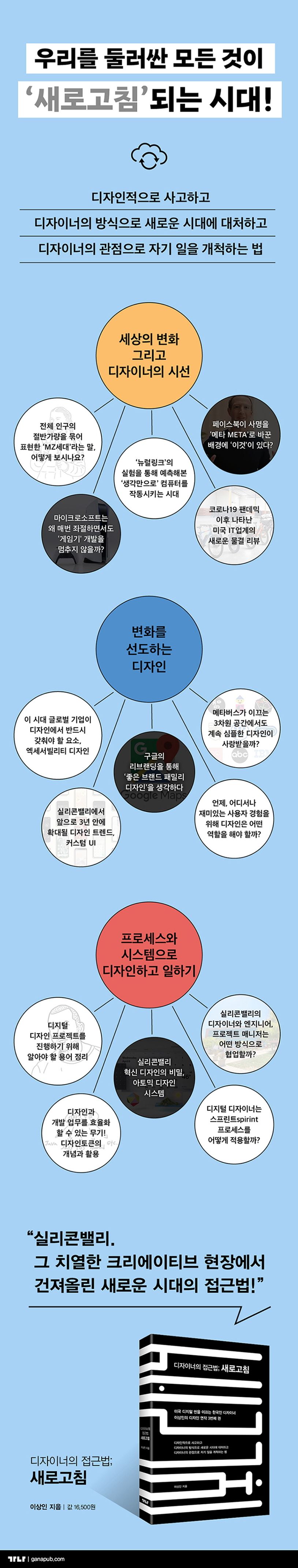 인류 역사상 가장 빠른 변화가 진행되고 있는 지금, 이 시대를 사는 우리는 새로운 세상에 어떻게 대처해야 할까? ‘디자이너의 접근법; 새로고침’은 디지털 디자이너 이상인이 실리콘밸리에서 일하며 경험하고 고찰한 것들을 바탕으로 세상의 변화를 다루고, 이 변화를 어떤 시선으로 바라볼지, 일하는 사람은 어떤 방식으로 접근할지 이야기한다.