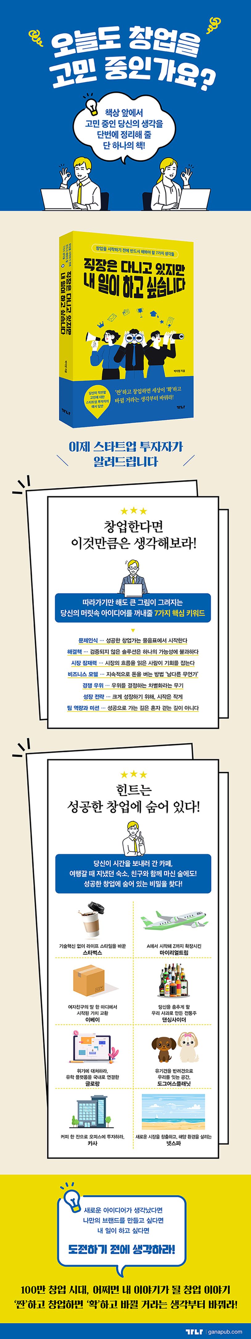이에 저자는 자신의 아이디어를 구체화할 수 있는 7가지 키워드를 제시하고, 스타트업 투자자로서 만난 이제 시작하는 국내 기업부터 유니콘이 된 해외 기업까지 다양한 사례를 분석, 정리해 알려준다. 특히 기업 발표 등에서 실제로 사용된 자료와 작성법, 조언들을 녹여 접하기 어려운 현장의 생생한 이야기를 들려준다. 이 책은 창업 성공 스토리가 아니라 ‘창업을 고민 중이라면 이렇게 아이디어를 점검해보세요’라고 말하는 창업 안내서이다. 도전하고 싶은 아이템이 있다면 이 책을 먼저 펼쳐보길 바란다.