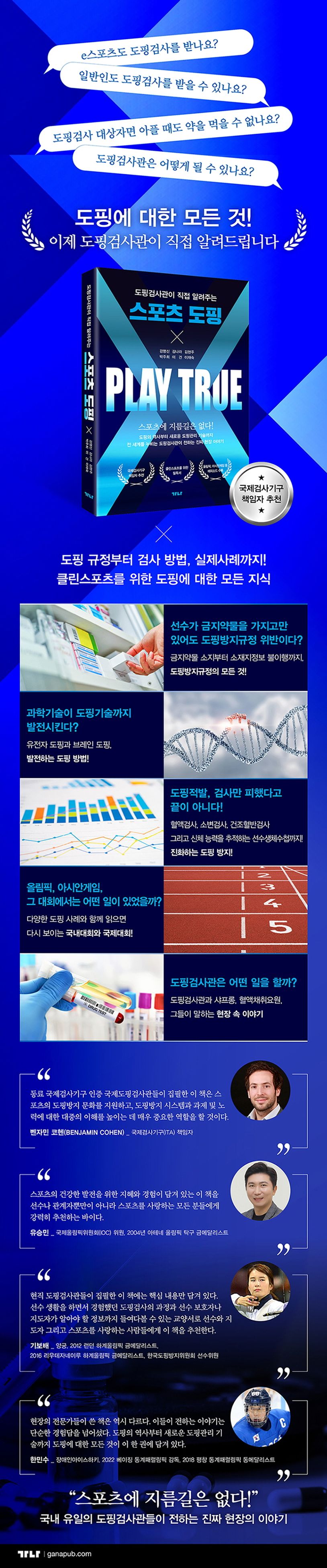 국제검사기구의 자격인증을 받은 국제도핑검사관인 저자들은 전 세계 스포츠 현장에서 활동하며 최고의 공격은 방어, 즉 도핑 방지를 위해 가장 중요한 건 도핑에 대해 정확히 아는 것임을 깨달았다. 『도핑검사관이 직접 알려주는 스포츠 도핑』은 도핑의 역사부터 도핑방지규정 그리고 일상에서의 주의사항까지 국내 유일 도핑전문들이 총망라한 도핑 필독서이다. 그리고 스포츠 현장에서 활동한 저자들의 경험과 도핑 역사에 한 획을 그은 실제 사례들을 덧붙여 선수뿐만 아니라 스포츠 관계자, 일반인까지 이 한 권을 읽는 것만으로 도핑의 위험성을 다시 한번 인지하고 클린스포츠로 한발 다가갈 수 있게 돕는다. ‘도핑’을 떠올렸을 때 ‘도핑은 금지약물을 먹는 거 아닌가?’, ‘도핑검사는 프로선수들만 받는 거 아닌가?’하는 생각이 들었다면 이 책을 펼쳐라. 이 책이 답이 되어 줄 것이다.