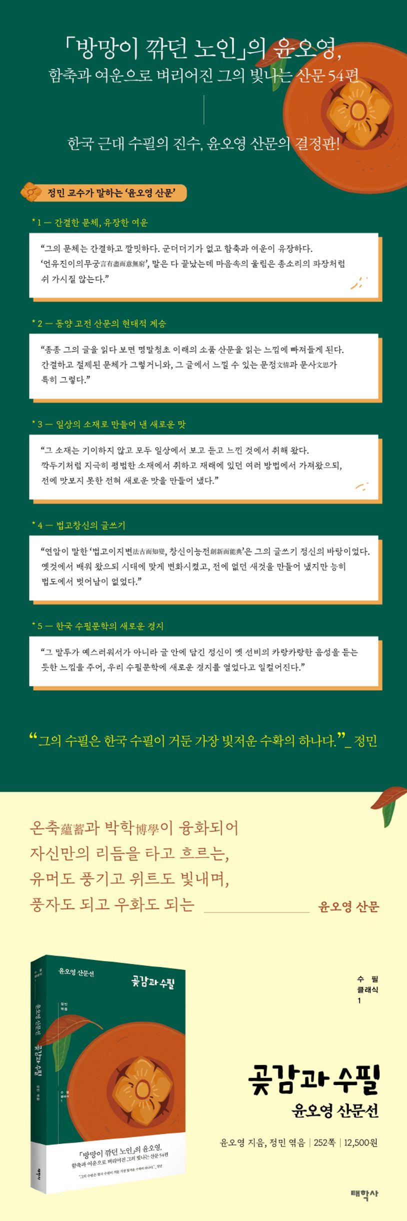 그동안 ‘태학산문선’ 시리즈의 한 권으로 사랑받아 왔던 『곶감과 수필』이 새롭게 단장한 모습으로 독자들을 만나게 되었다. 이 책은 엮은이인 정민 교수가 윤오영의 『고독의 반추』(1974), 『방망이 깎던 노인』(1976), 『수필문학입문』(1975) 등에 수록된 작품들 중에서 54편을 가려 뽑은 것으로, 주제와 내용을 고려하여 새롭게 배열하고, 현대 독자들의 눈높이에 맞게 표기를 손보고, 인용 한시 등 한문 원문에 번역문을 붙였다. 그야말로 오늘의 독자들을 위해 윤오영 산문의 정수만을 모아 놓은 선집이라 할 수 있다.