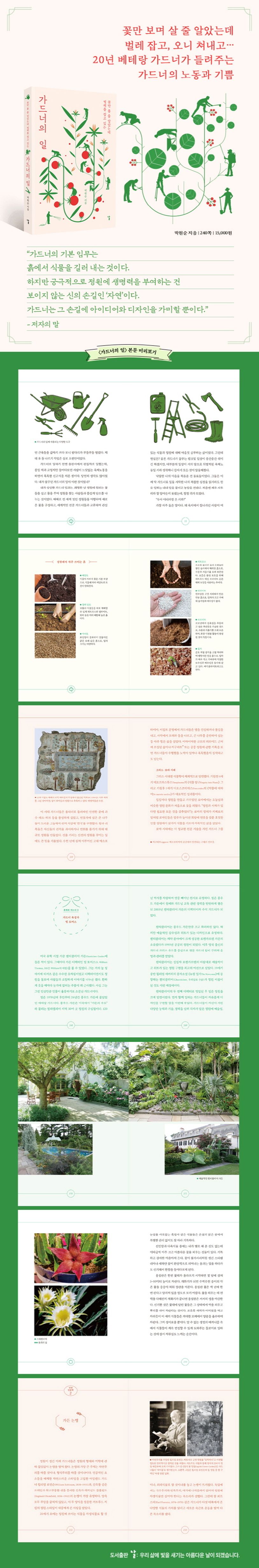 20년 넘게 가드너로 일해 온 저자가 한 송이 꽃, 아름다운 정원을 위해 그 뒤에서 가드너들이 어떤 일들을 하는지 자신의 경험을 바탕으로 소박하게 써 내려간 산문이다. 가드너들은 오니를 쳐내는 일부터 각종 행정 문서 처리까지 수많은 일을 해내는 ‘백공’. 하지만 이들 일에 마침표를 찍어 주는 건 언제나 ‘자연’임을 저자는 겸허히 고백한다.