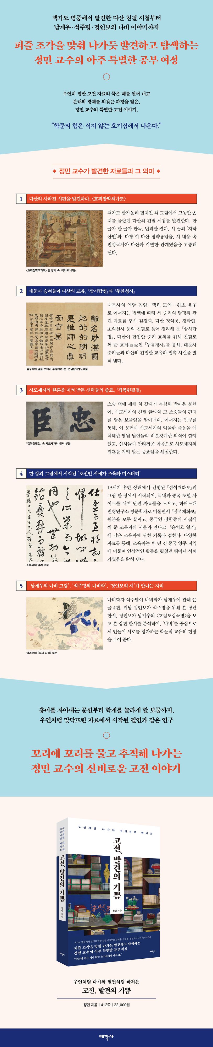 고전학자들은 언제나 새로운 ‘자료’에 목말라한다. 새로 발견된 자료의 가치는 기존 학문 성과를 보완해 주는 역할에서부터, 그간의 학문적 공백을 메워 줄 미지의 영역에 관한 자료, 나아가 기존 연구 성과를 뒤집을 만한 자료까지, 그야말로 천차만별이다. 조선 지성사의 전방위적 분야를 탐사하며 옛글에 담긴 깊은 사유와 성찰을 우리 사회에 전하고 있는 정민 교수가 흥미를 자아내는 문헌부터 학계를 놀라게 할 보물까지, 그동안 발견하여 연구한 자료들에 관한 논문 16편을 『고전, 발견의 기쁨』에 담아 출간했다.
