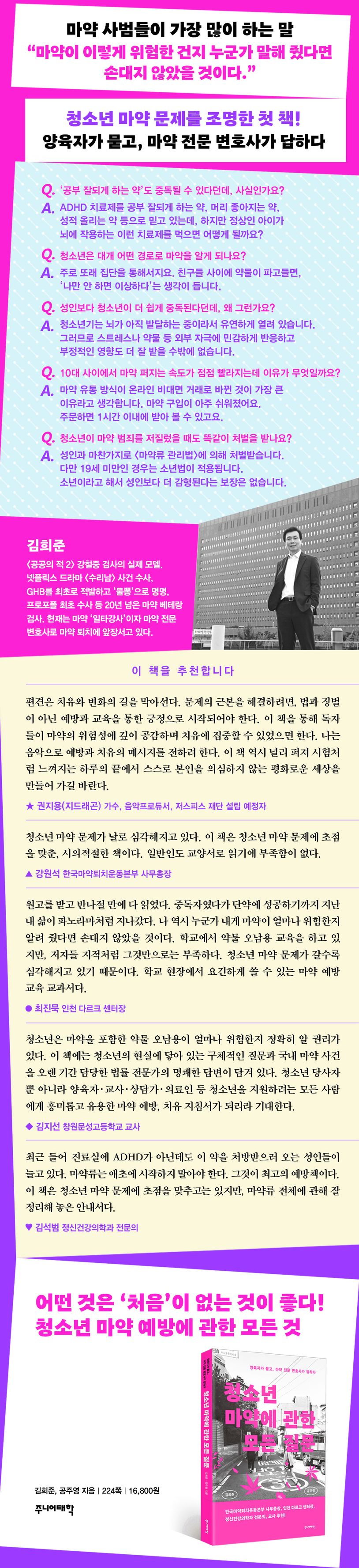 《청소년 마약에 관한 모든 질문》은 국내에서 처음으로 청소년 마약 문제를 조명한 책으로, 10대 자녀를 둔 양육자와 마약 전문 변호사가 묻고 답하는 형식이다. 저자 김희준 변호사는 20년 넘게 강력부에서 일했다. 마약 문제에 관한 한 손꼽히는 검사 출신이다. 넷플릭스 드라마 〈수리남〉으로 잘 알려진 조봉행 사건을 비롯해 중국 흑사회, 연예계, 화이트칼라 사건 등 많은 마약 사건을 진두지휘했다. 신종 마약인 GHB를 처음 적발하고 ‘물뽕’이란 이름까지 붙인 일은 널리 알려져 있다. 프로포폴도 국내에서 최초로 수사해 GHB와 함께 마약류로 등재시켜 처벌 근거를 마련해 놓았다.