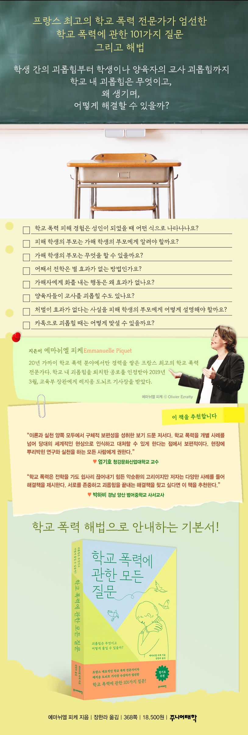 학교 폭력은 우리나라에서만 일어나는 현상이 아니다. 학교가 있는 곳이면 어디서든 벌어진다. 이 책은 프랑스의 대표적인 학교 폭력 전문가가 20년 가까이 활동하면서 가장 많이 받은 질문을 엄선해 그에 답한 책이다. 저자 에마뉘엘 피케는 학교 폭력 근절을 위해 애쓴 공로로 2019년 교육부 장관에게 레지옹 도뇌르 기사장을 받았다. 레지옹 도뇌르는 프랑스 정부에서 주는 최고의 훈장이다.