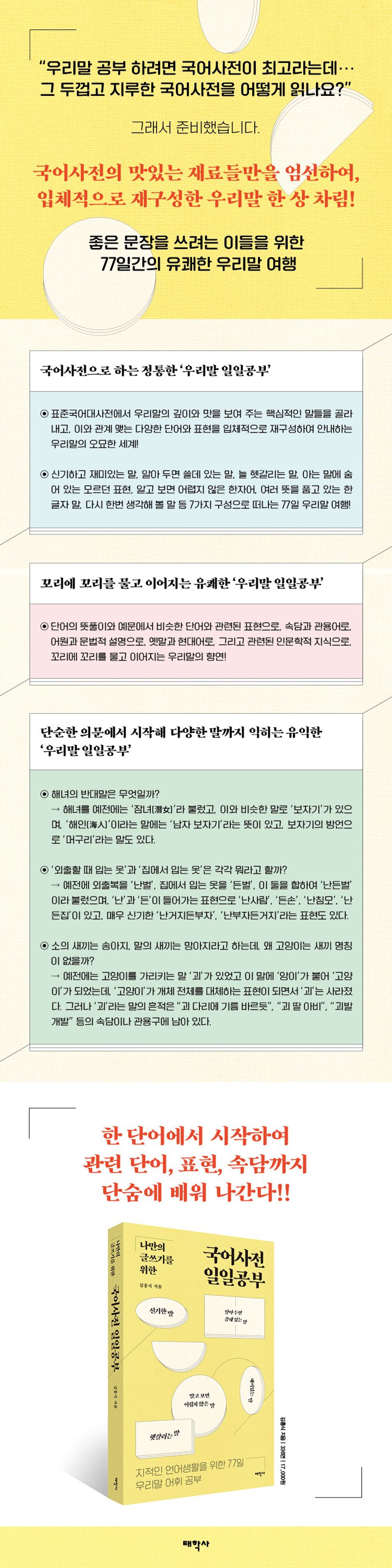 요즘은 글을 쓸 때 국어사전을 참고하는 사람이 드물다. 하지만 불과 수십 년 전만 해도 글을 쓰고자 하는 사람이라면 국어사전을 곁에 끼고 사전이 닳도록 보곤 했는데, 요즘 사람들은 사전을 찾아보거나 참고가 될 만한 좋은 글을 읽어 보지도 않고 컴퓨터 자판부터 두드리기 시작한다. 물론, 그렇게 해서 좋은 문장이 나온다면 얼마나 좋겠는가마는, 그런 일은 결코 없다. 단 한 문장이라도 제대로 쓰려면, 표현하려는 말 하나하나의 참뜻을 제대로 알아야 한다. 《국어사전 일일공부》는 이런 문제의식에서 쓰였다. 저자는 우리말보다는 국적 불명의 외국어, 비문을 무차별적으로 사용하는 세태, 그리고 우리말의 뼈대를 갉아먹는 외국어 문법의 침략을 안타까이 여겨, 표준국어대사전을 ㄱ부터 ㅎ까지 세 차례나 정독하고 이 책을 썼다.