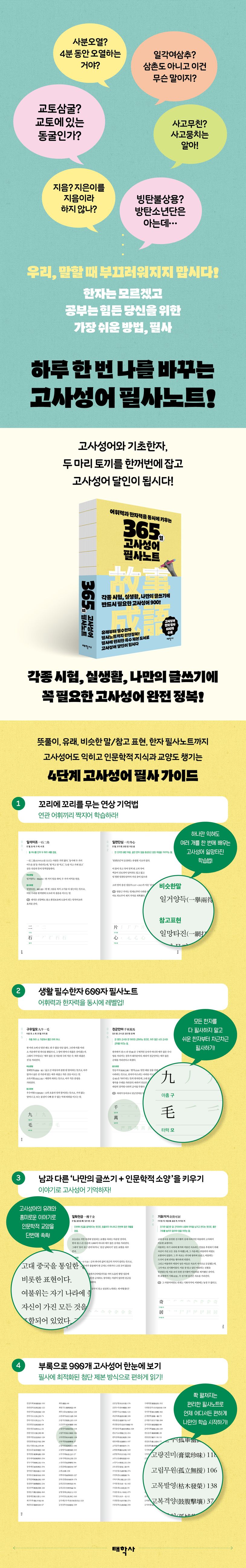 이 책은 우리 일상생활에 꼭 필요한 365개의 고사성어를 선별하여 하루 하나씩 부담 없이 익혀 나갈 수 있도록 구성했다. 각 고사성어의 뜻풀이와 유래, 비슷한말/참고표현, 예문, 필수 한자 필사까지, 간결하면서도 핵심적인 정보만 담아 효율적인 학습이 되도록 했다. 아울러 연관된 또 다른 고사성어까지 자연스럽게 확장시켜 익혀 나가다 보면 어느새 900개의 고사성어와 600개의 기초한자를 내 것으로 만드는 놀라운 경험을 하게 될 것이다. 물론 고사성어와 관련된 인문학적 지식과 교양은 덤이다.