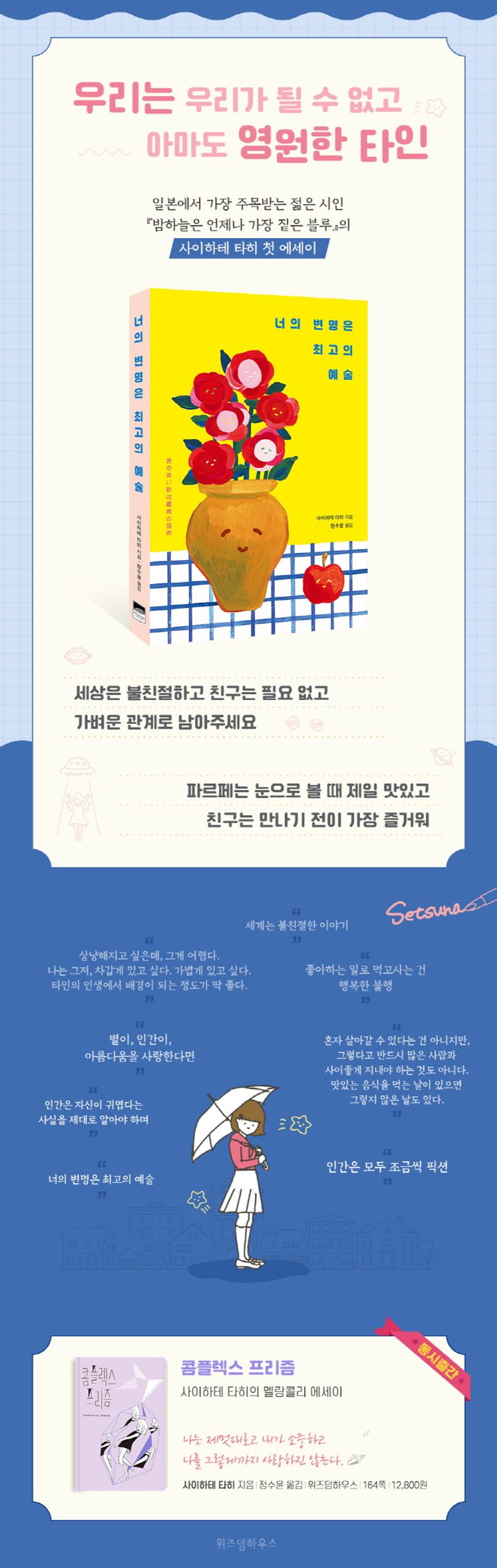시의 경계를 허물고 시가 갈 수 있는 모든 곳을 종횡무진하는 사이하테 타히의 에세이가 국내에 처음 소개된다. 관계라는 수면 위에서 흔들리지 않고 사는 법을 담은 『너의 변명은 최고의 예술』과 상처를 직시하고 자신을 있는 그대로 긍정하는 『콤플렉스 프리즘』을 동시에 만나볼 수 있다. 누구나 품고 있지만 미처 말이 되지 못한 감정을 감각적이고 살아 있는 언어로 건져 올린 두 권의 에세이가 지금 이 순간을 살아내고 있는 밀레니얼의 마음을 거울처럼 비춘다.