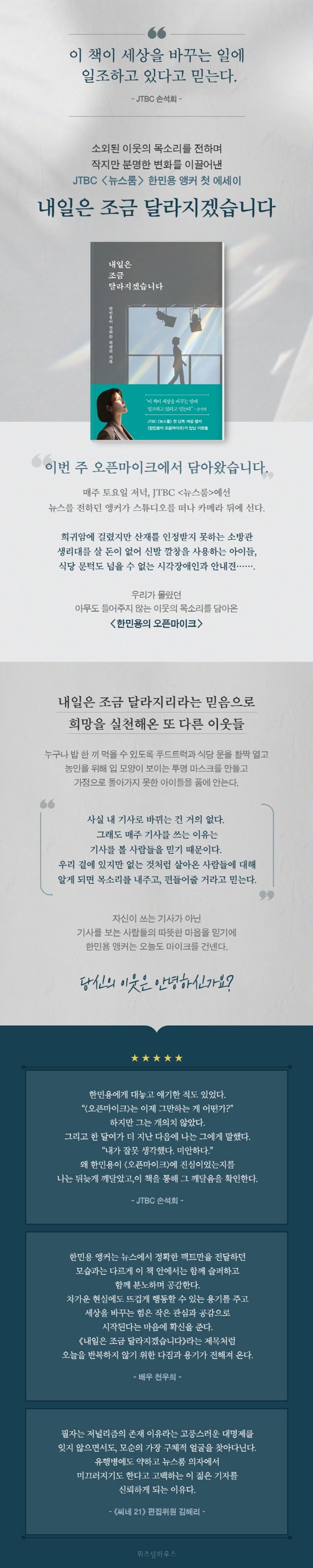 한민용 앵커가 직접 취재하고 보도한 〈한민용의 오픈마이크〉의 취재 일기를 담은 《내일은 조금 달라지겠습니다》가 출간되었다. 우리 곁에 있지만 우리가 몰랐던 이웃의 아픔, 그리고 조용히 그들을 돕고 있던 또 다른 이웃에 관한 이야기다. 하루에 7번 식당 출입을 거절당한 시각장애인과 안내견, 급식카드를 사용할 식당이 없어 편의점에서 끼니를 때우는 아이들….. 한민용 앵커는 이들에게 망설임 없이 손 내민 이웃들을 조명하는 한편, 타인의 선의에만 기대지 않을 수 있도록 정책적인 대안까지 제시하며 작지만 분명한 변화를 이끌어낸다. 내일은 조금 더 달라지리라는 믿음으로, 희망의 기록은 계속된다.