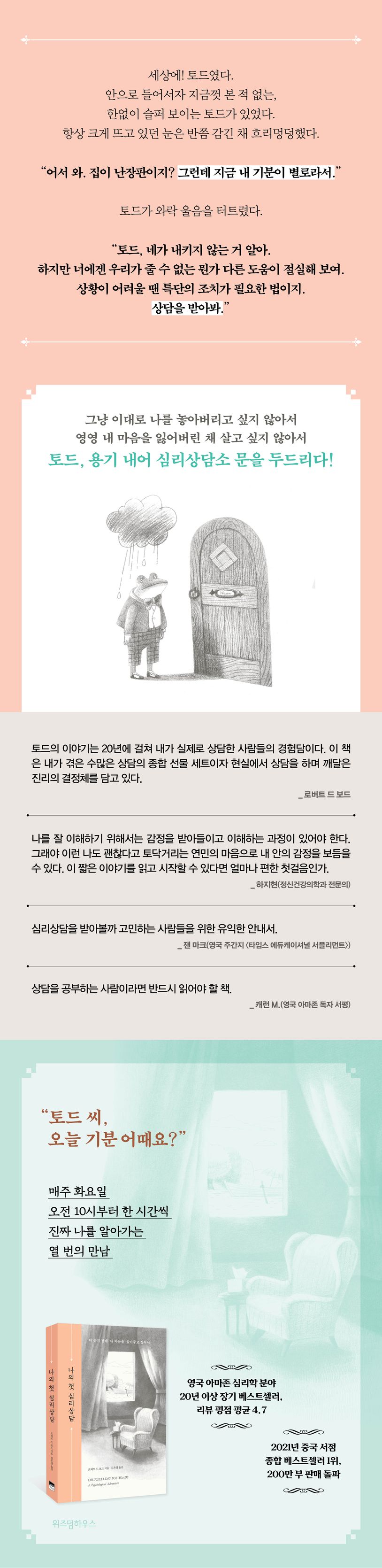 『나의 첫 심리상담』은 고전 동화 『버드나무에 부는 바람』의 주인공 토드가 심리상담을 받는 과정을 상세히 보여줌으로써, 상담을 받아볼까 고민하는 사람들에게 좋은 시뮬레이션을 제공한다. 다사다난한 모험을 마치고 집으로 돌아온 토드는 왠지 모를 우울감에 사로잡혀 집 안에만 틀어박혀 지내는데, 심리상담사 헤런과 열 번의 만남을 가지며 자기 자신을 돌아보고 변화할 용기를 얻는다. 심리상담가이자 조직 컨설턴트로 활동했던 저자 로버트 드 보드는 남녀노소 모두에게 친근한 고전 동화를 활용해 심리상담에 대한 벽을 허물고 모두가 토드처럼 용감하게 자신의 진실된 마음을 알아가는 여정에 나서기를 응원한다.