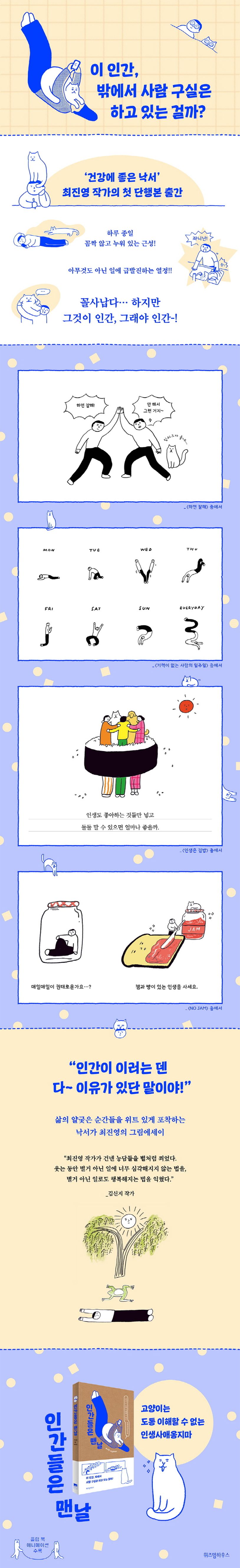 일찍이 한 이름 없는 고양이가 인간들을 찬찬히 지켜보고 이와 같이 일갈한 기록이 있다. 고양이는 도통 이해를 할 수가 없다. 좀처럼 차분히 있지를 못하고 맨날 허둥지둥, 우왕좌왕인 데다가 걸핏하면 가진 것에 비해 욕심을 부리다 푹 고꾸라지기 일쑤다. 그래도 어쩐지 미워할 수 없는 잔망스러운 구석이 있다. 그것이 인간, 그래야 인간인 것이다. 『인간들은 맨날』에서는 하루 종일 꼼짝 않고 누워 있을 수 있는 근성, 아무것도 아닌 일에 급발진하는 열정으로는 누구에게도 뒤지지 않는 인간의 자화상을 속속들이 드러낸다. 인간들의 지질함을 내려다보며 쯧쯧 혀를 차는 고양이에 공감하면서도, 마음 한 켠에서는 시나브로 이해가 되고 마는 아이러니를 경험할 수 있을 것이다. 이 책은 몸과 마음의 건강에 좋은 낙서로 독자적인 영역을 개척해온 최진영 작가(a.k.a. 낙서가)의 첫 그림에세이이다. 그의 위트와 활력이 넘치는 드로잉을 사랑하는 독자라면, 여러 반려동물을 비롯하여 심지어는 사물들이 이곳저곳에서 인간에게 건네오는 말들이 흥미롭게 들려올 것이다.