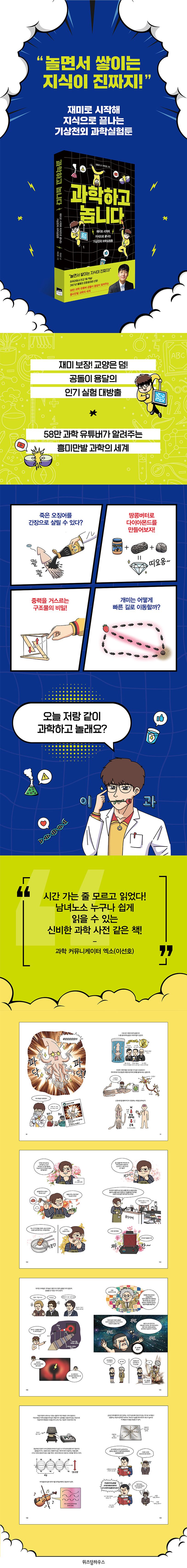 『과학하고 놉니다』는 ‘실험’과 ‘체험’을 주요 콘텐츠로 다루는 58만 과학 유튜버 ‘공돌이 용달’이 지금까지 선보였던 과학 실험 영상 중 스무 가지를 만화로 담은 책이다. 그가 기상천외하고 쓸모없어 보이는 데다가 위험하기까지 한 실험을 하는 이유, ‘궁금하잖아요~’를 만화적으로 만날 수 있는 책이기도 하다. 인기 실험 영상들을 만화화하면서 세계관(스토리 라인 구축)을 확장했고, 관계성(새로운 친구 캐릭터 등장)을 부여했으며, 과학 이론은 더욱 심도 있게 다루었다. 나아가 영상을 보다가 궁금한 게 생기면 책을 펼쳐보고, 책을 읽다가 궁금한 게 생기면 영상을 찾아볼 수 있는 연결성을 탄탄하게 구성했다. 용달의 초인기 영상인 ‘죽은 오징어 간장을 부으면 ○○한다’, ‘포도를 전자레인지에 넣고 돌리면 일어나는 일’, ‘물에 방수 스프레이를 뿌렸더니, 이런 결과는 상상도 못 했다’, ‘땅콩버터와 석탄으로 다이아몬드 만들기 실험’ 등도 책에서 볼 수 있으며, 생물, 화학, 물리, 탐험의 영역으로 나누어 골고루 알차게 담았다.