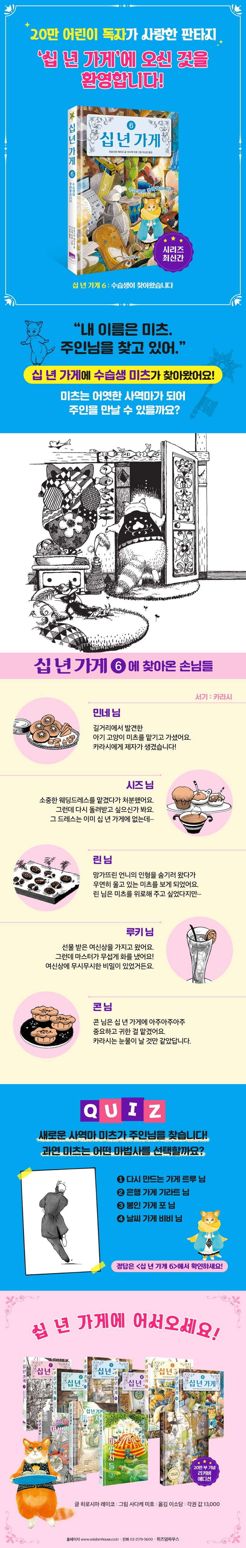 평화로운 십 년 가게에 새로운 가족이 찾아왔어요. 발견 가게 민네 님이 데려온 아기 고양이 ‘미츠’가 그 주인공입니다. 작은 아기 고양이 미츠는 십 년 가게에서 수습생으로 일하며 어엿한 사역마가 될 준비를 한다고 해요. 미츠는 십 년 가게의 수습생으로서 여러 손님을 맞이하며 카라시에게 배운 대로 점점 성장해 갑니다. 6권에서 새롭게 등장하는 마법사 알림 가게 토토 님은 미츠가 주인을 찾고 있다는 소식을 다른 마법사들에게 전해 주었지요. 미츠의 주인이 되기 위해 앞다투어 나선 마법사들은 치열한 경쟁을 펼치는데요. 과연 미츠는 누구를 주인으로 선택할까요?