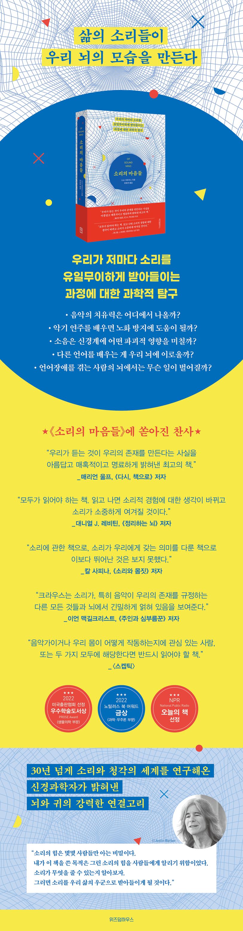 우리의 듣는 뇌는 방대하다. 소리를 들을 때 뇌는 우리의 앎, 감정, 생각, 움직임, 다른 감각들과 상호 작용한다. 우리는 수동적으로 듣기만 하는 존재가 아니며 소리에 주체적으로 관여한다. 또한 소리는 삶의 여러 측면에 영향을 미치고 그리하여 우리 뇌의 모습을 결정한다. 30년 넘게 선구적으로 소리와 청각을 연구해온 신경과학자 니나 크라우스는 《소리의 마음들》에서 소리와 뇌의 협업 관계를 살펴보며 소리를 처리하는 데 뇌의 핵심 기능들이 가동되는 과정을 보여준다. 책을 읽고 나면 소리적 경험이 우리 존재에 근본적인 흔적을 남긴다는 사실을 또렷하게 알 수 있다. 우리가 살면서 접하는 소리들은 우리 뇌의 모습을 더 좋게, 더 나쁘게 만들며, 우리가 사는 소리적 세계를 의미 있게 만들도록 돕는다.